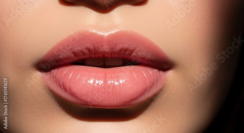 Obraz premium Close-up of pink, glossy lips with striking light/shadow