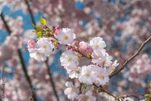 © eugen, Obraz premium close-up of pink tree buds and blossoms on a defocused sky
