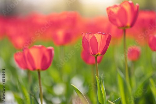 Obraz premium Close-up of pink tulips in a field of pink tulips. Relaxing spring landscape, sunny blurred view. Inspirational nature background