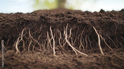 © Brian, Fototapeta premium Close-up of plant roots in dark soil.