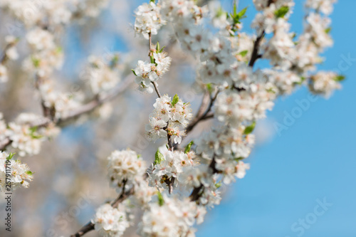 Fototapeta premium Close up of plum and cherry blossom. White spring flowers on blue sky.