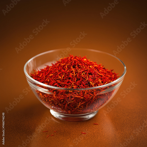 © Hoseein, Fototapeta premium Close-Up of Premium Saffron Threads in Wooden Spoon on Dark Red Background