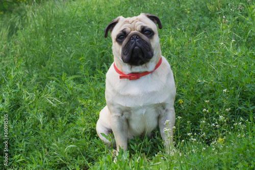 © Anastasija, Obraz premium Close-up of Pug on the green grass in the garden