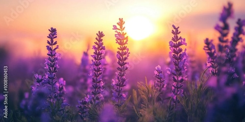 © ABDULHAMID, Naklejka premium Close-up of purple flowers growing on field during sunset.