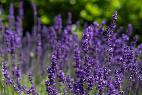© Volha, Naklejka premium Close-up of purple lavender flowers in full bloom on a sunny day, perfect for essential oil extraction. Herbal healing, aromatherapy, natural wellness and relaxation through lavender