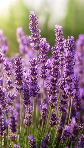 © Nob, Naklejka premium Close-up of Purple Lavender Flowers with Green Stems in a Field