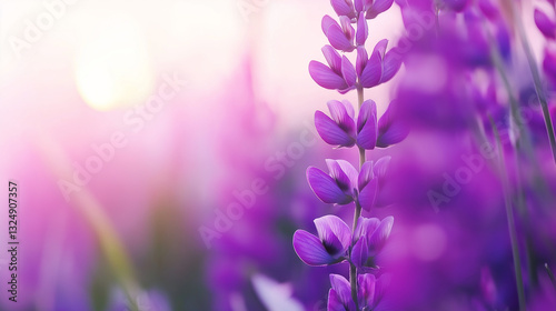 Naklejka premium Close-up of purple lupine flowers bathed in warm sunlight, creating a dreamy...