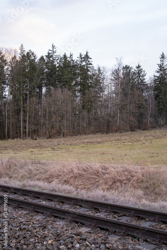© Mariana Verbenets, Fototapeta premium Close-Up of Railway Tracks with Gravel