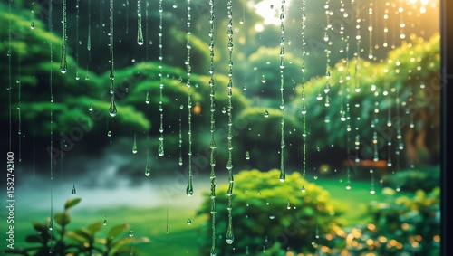 © Mink, Obraz premium Close-up of raindrops gently sliding down a glass window, outside view of a green garden, soft ambient lighting indoors