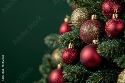 © talkative.studio, Fototapeta premium Close-up of Red and Gold Christmas Ornaments on a Green Christmas Tree