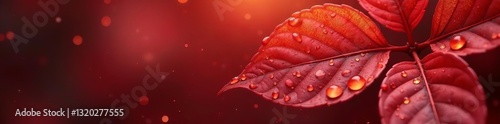 Fototapeta premium Close-up of red and gold leaves with dew drops, foliage, dew