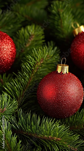 Fototapeta premium Close up of red christmas ornaments on green pine branches festive background
