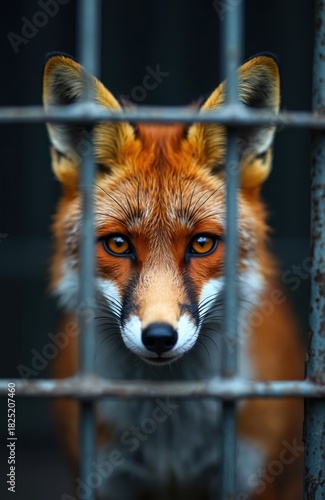 Naklejka premium Close up of red fox behind bars. Orange fur animal with piercing eyes stares through cage. Wild mammal in captivity. Fox locked. Zoo habitat for predator behind fence.