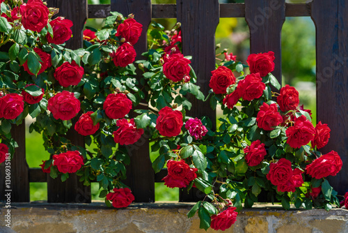 Naklejka premium Close-up of red roses growing along wooden fence on sunny day. Blooming roses create a romantic garden atmosphere, cozy feel. Wooden fence is abundantly entwined with climbing bush of bright red rose