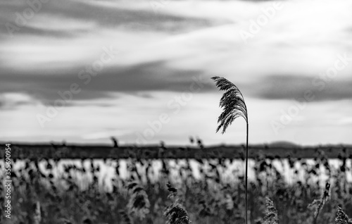 © NLLC, Obraz premium Close up of reed with lake and mountain in background