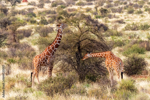 © Goldilock Project, Naklejka premium Close-up of Reticulated Giraffe - Giraffa camelopardialis reticulata- grazing in the Samburu national reserve, Kenya