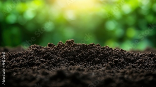 Fototapeta premium Close-up of Rich Dark Soil Against Vibrant Green Background for Gardening Use
