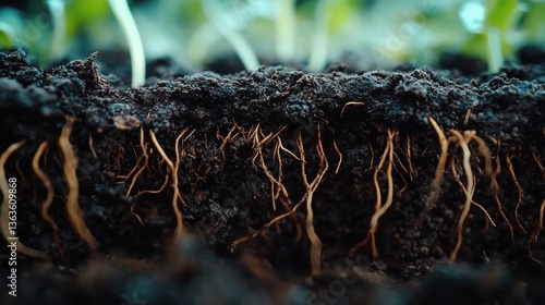 Fototapeta premium Close-up of rich, dark soil with intricate textures, tiny roots, and organic...
