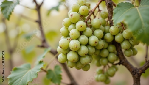 Fototapeta premium Close-Up of Ripe Green Grapes Growing on Vine in a Vineyard Under Natural Light