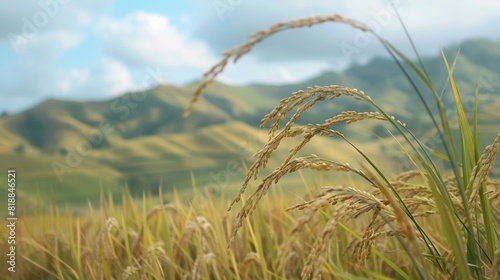 Fototapeta premium Close-up of ripe rice ears swaying gently in the breeze against a backdrop of rolling hills