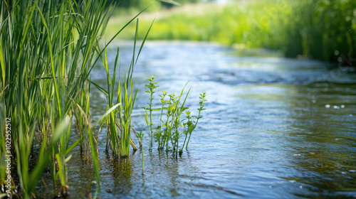 © Chonticha, Fototapeta premium Close-up of river reeds and aquatic plants along the river edge