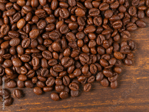 © , Naklejka premium Close up of roasted coffee beans on a wooden surface