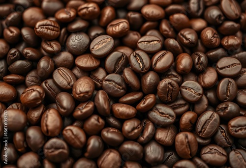 Naklejka premium Close-up of roasted coffee beans, rich brown tones, textured surface, photography, organic