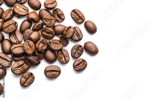 © Kiangdeb, Naklejka premium Close-up of roasted coffee beans scattered on a transparent background, highlighting their rich brown color and texture