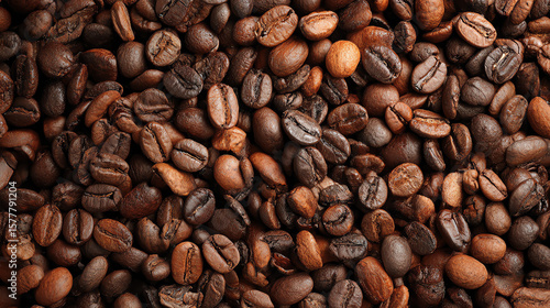 Naklejka premium Close-up of roasted coffee beans showcasing a variety of shades and textures, perfect for coffee lovers and culinary enthusiasts.