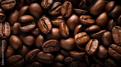 © GenBy, Naklejka premium Close-up of roasted coffee beans, showcasing their rich brown texture and inviting aroma, perfect for representing a coffee lover's delight.
