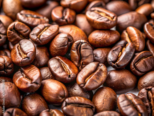 © Hajira, Fototapeta premium Close-Up of Roasted Coffee Beans with Rich Texture and Dark Brown Glossy Surface on White Background