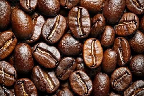 Fototapeta premium Close-up of roasted coffee beans with rich texture and deep brown tones....