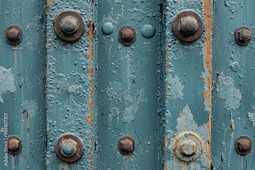 © Outkast, Fototapeta premium Close-up of Rusted Metal with Peeling Blue Paint and Bolts