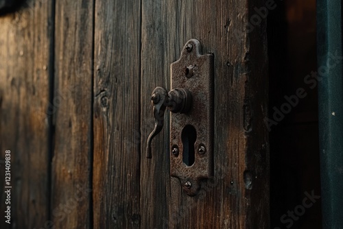 Fototapeta premium Close-up of rustic, aged wooden door with antique metal handle and keyhole.