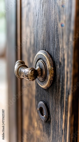 Obraz premium Close-up of rustic brass door handle on wooden surface