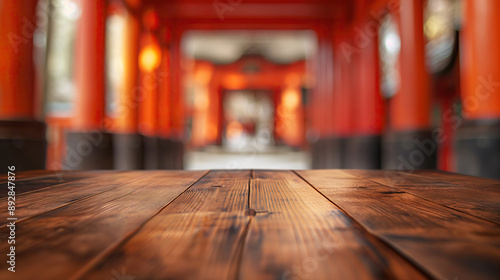 © Schmidt, Fototapeta premium close up of rustic empty wooden table with blurred kyoto shrine background