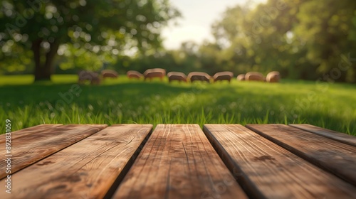 © Schmidt, Fototapeta premium close up of rustic empty wooden table with blurred pigs grazing on grass background