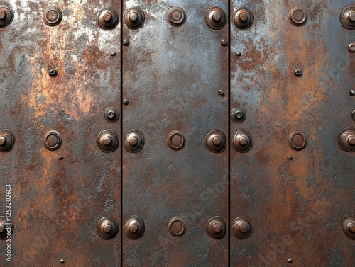 © BrandwayArt, Fototapeta premium Close-up of rustic metal door with rivets and patina