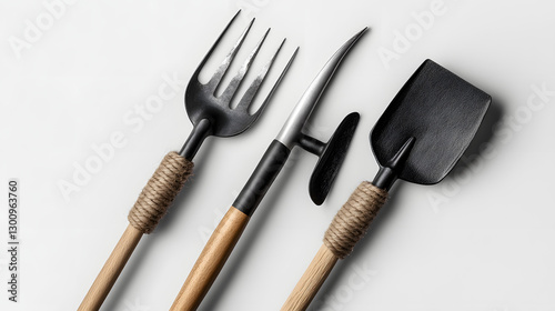 Fototapeta premium Close-up of rustic wooden-handled garden tools including a pitchfork and a trowel UHD 4K Image