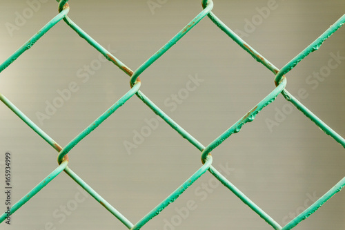 Fototapeta premium Close up of rusty green wire fence and blury background