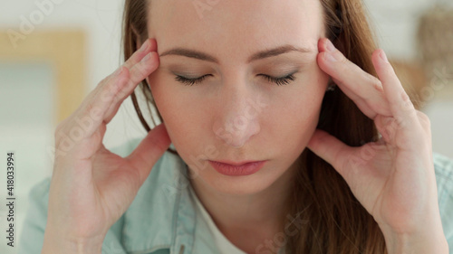 Fototapeta premium Close up of sad tired woman touching her head having headache or depression
