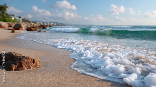 © Khafidnugra, Fototapeta premium Close Up Of Sandy Tropical Beach With Gentle Waves Rolling Onto Shore Under A Bright Blue Sky With Scattered Clouds On A Sunny Day