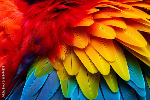 Obraz premium Close up of Scarlet macaw bird's feathers, exotic nature background and texture. Beautiful nature background, close up details texture of Scarlet macaw parrot bird feathers