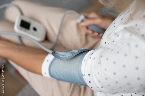 © fizkes, Fototapeta premium Close up of senior woman measure pressure with tonometer