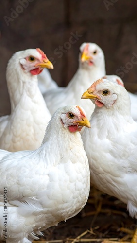 Fototapeta premium Close-up of several white chickens in a coop with yellow beaks