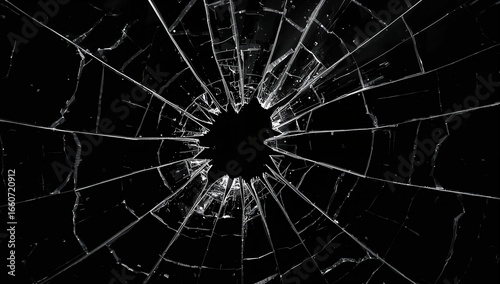© Friedbert, Fototapeta premium Close-up of shattered glass with radial cracks on a black background