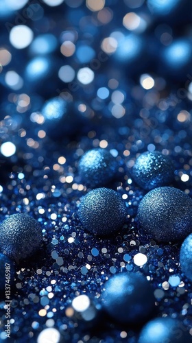 Fototapeta premium Close-up of shimmering blue ornaments and glitter on a sparkling surface,...