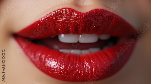 Obraz premium Close-up of shimmering red lips showcasing a glossy finish and bright white...