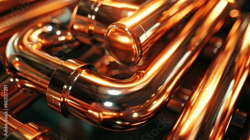 © NovaVision, Naklejka premium Close-up of Shiny Copper Pipes with Elbows. Generative ai.
