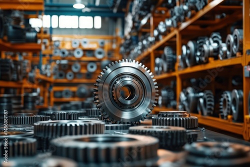 Fototapeta premium Close-up of shiny metal gear parts arranged on a surface with numerous gears stored on industrial orange shelving in the background inside a factory setting, conveying precision and engineering
